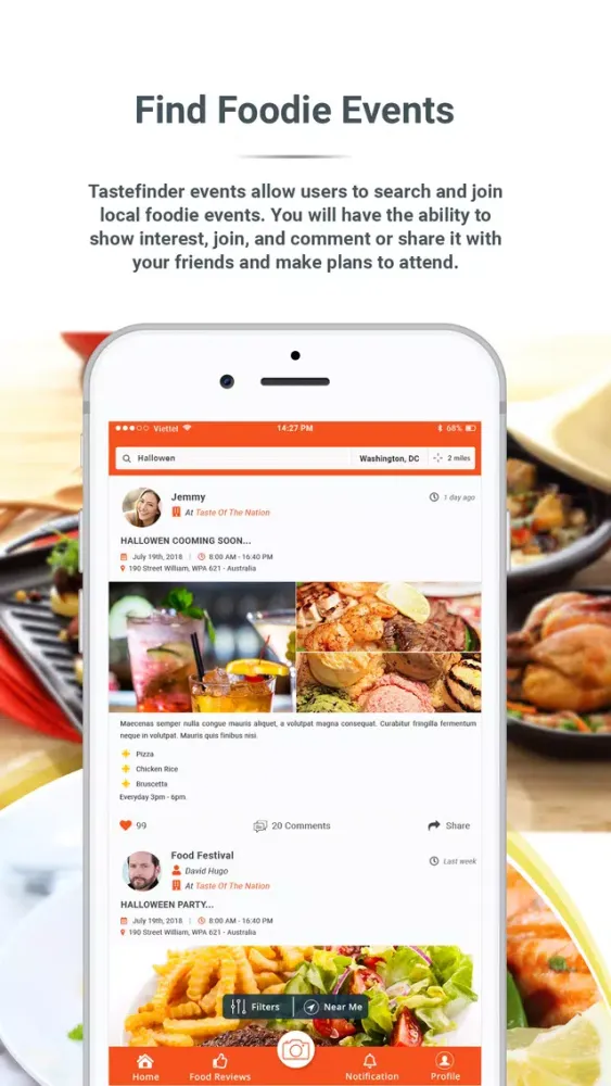 *Find Foodie Events - Don’t you hate it when you miss food truck week or restaurant week because you didn’t hear about it? Tastefinder events allow users to search and join local foodie events. You will have the ability to show interest, join, and comment or share it with your friends and make plans to attend.