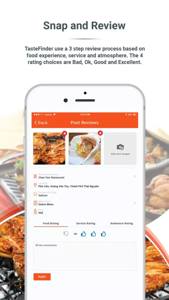 *Snap and Review - No other platform is using our unique experience rating system. TasteFinder use a 3 step review process based on food experience, service and atmosphere. The 4 rating choices are Bad, Ok, Good and Excellent.
