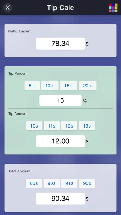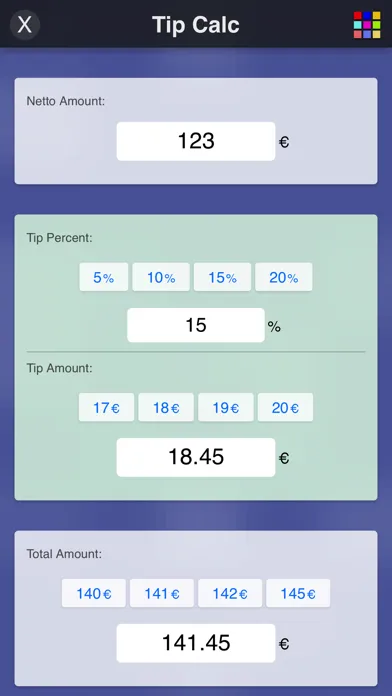 This app calculates helps you calculating the right tip. Enter the net amount, tap on a percentage and you are done. You can modify the tip and the total sum with the tap of a finger create an even sum for either tip or total.