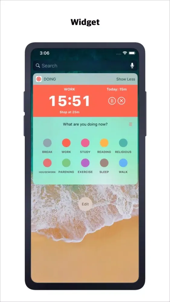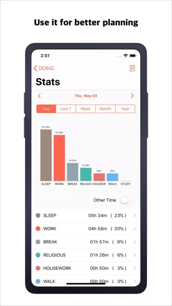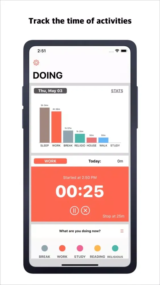 'Doing' is to track the time of your main activities. Work, study, reading, parenting, exercise, sleep, etc. Record your main activity time. And use it for better planning.