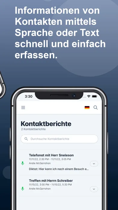 - Einsprechen von Informationen durch Tippen auf das Mikrofon und den Stopp-Button möglich > durch Bestätigung wird Diktat in gewünschten Kontaktbericht übertragen