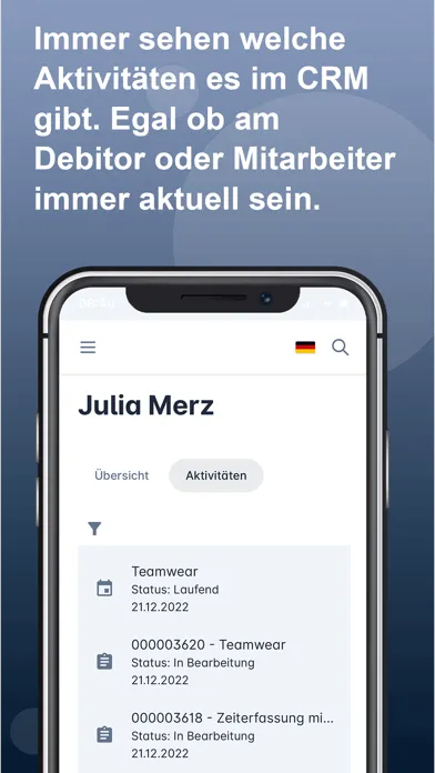 - Aktivitäten wie Termine, Besprechungen, Aufgaben und Anfragen am Debitoren einsehen und filtern können