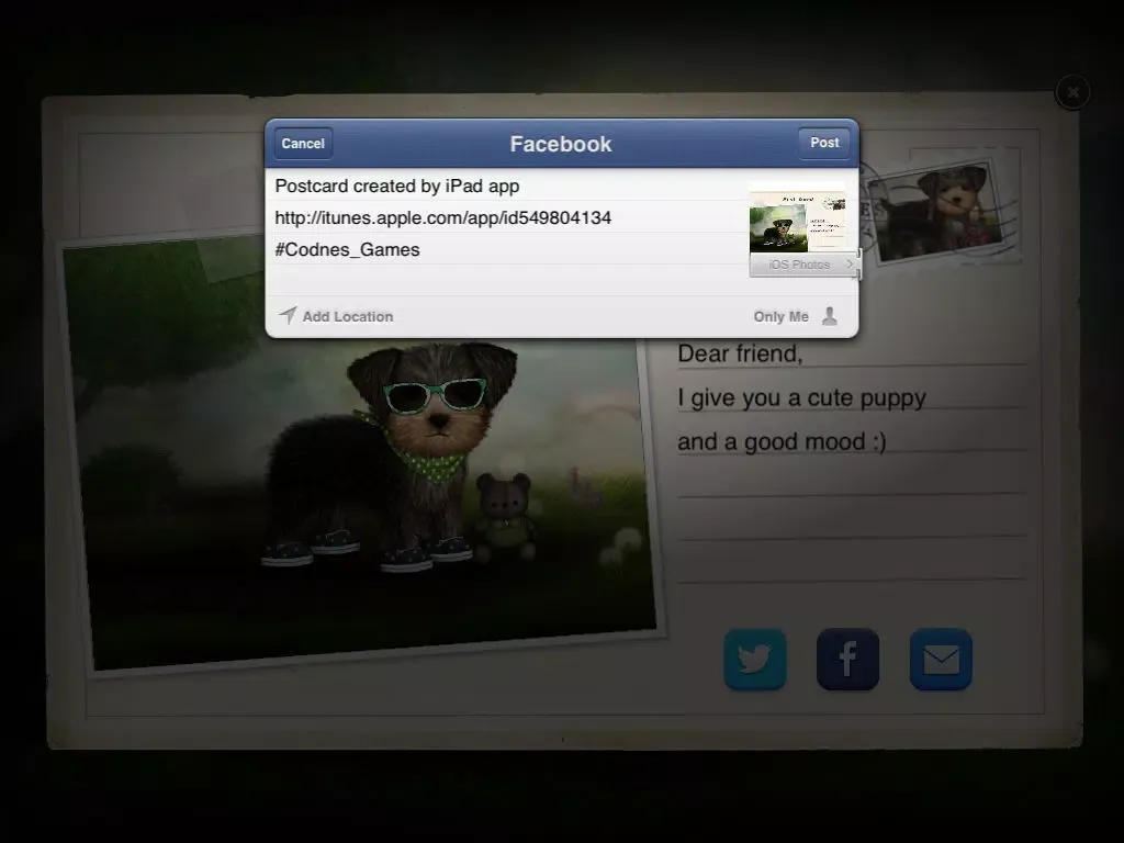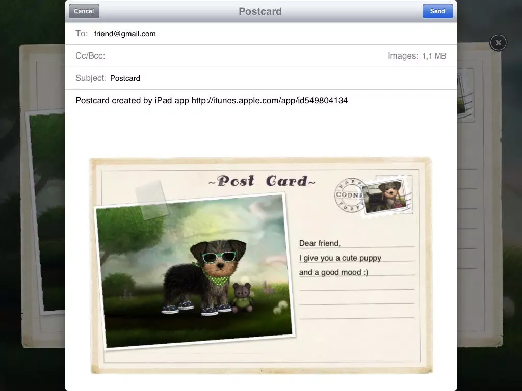 Features of this game is that you can take a picture of you dressed pet, and send a postcard to your friends and relatives: