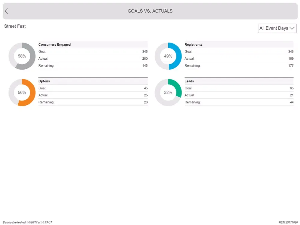 Verify your event’s performance against goals. Monitor KPI’s by specific event day, location and device to determine if adjustments are needed to improve desired outcome.