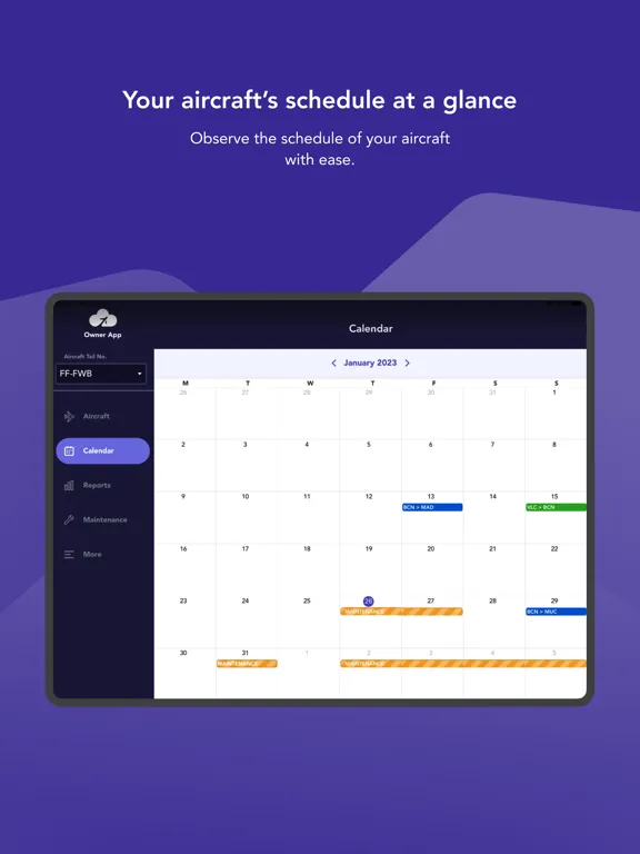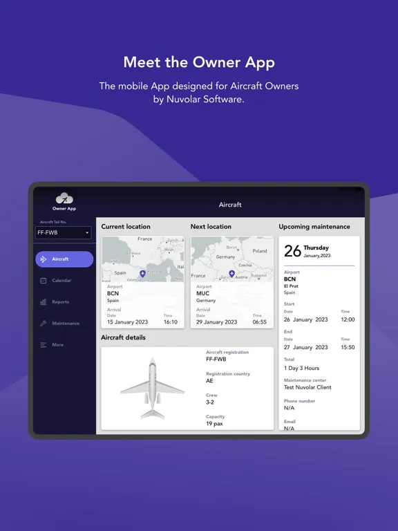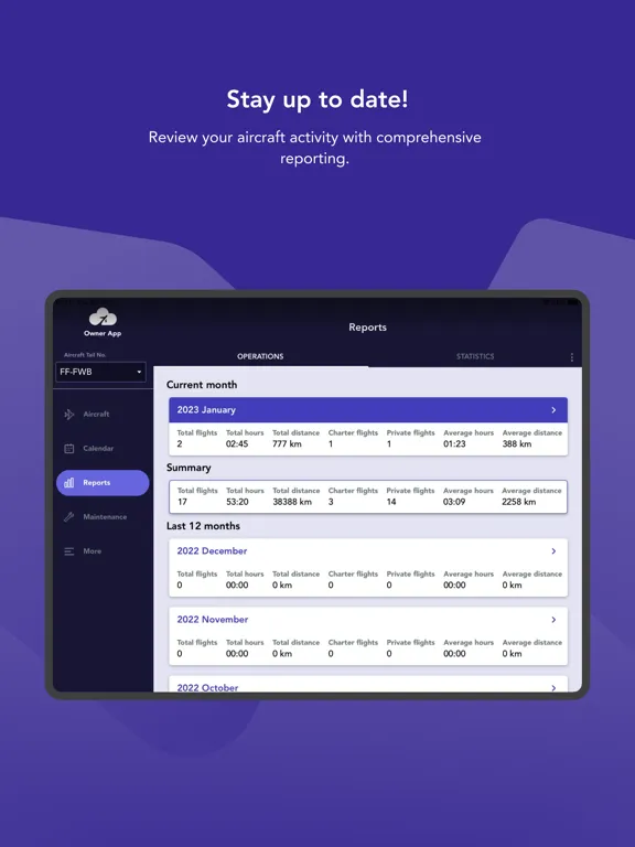 The application is aimed at providing aircraft owners with up-to-date information about the schedule, maintenance data and aircraft availability as well as comprehensive reporting and statistics of the operations that the aircraft has been involved in.