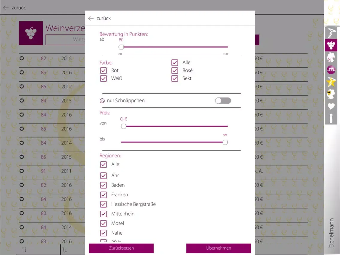 Die jährliche Bestandsaufnahme deutscher Weine ist auch als App erhältlich. Die Basisversion bietet fünf ausgewählte Weingüter und deren Beschreibung und Weinbewertungen. Die vollständigen Informationen des neuen Jahrgangs und alle Weinbewertungen können kostenpflichtig als InApp-Kauf erworben werden.