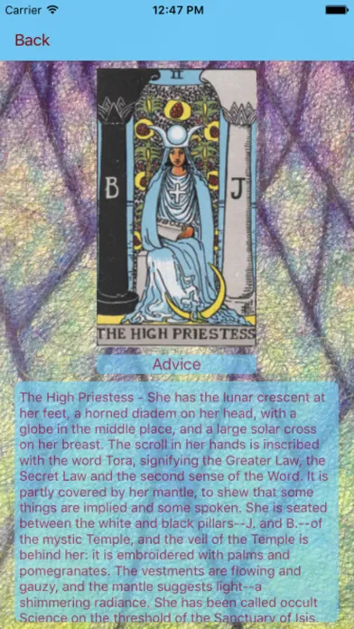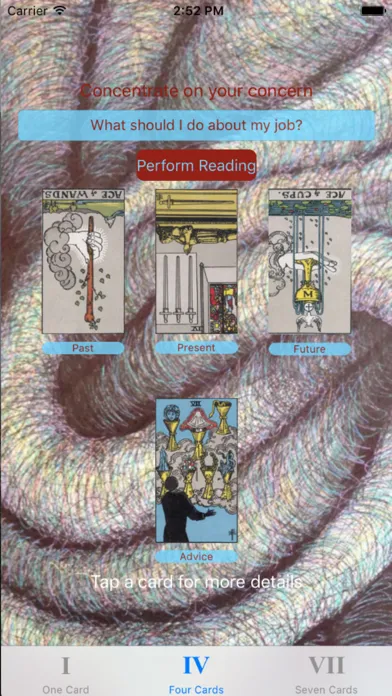 Tarot Card Reader provides an easy and quick tarot card reading. When something is on your mind and you need a guide to what the cosmos has in store for you, you can use this app for an answer. Simply concentrate on your concern, write it down to focus if you like, then press the "Perform Reading" button. A tarot card generated by the universe will be shown. Tap the card for further information.
