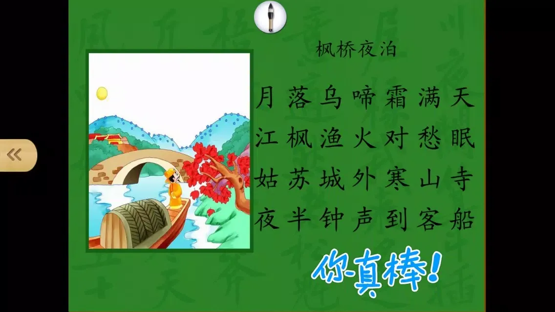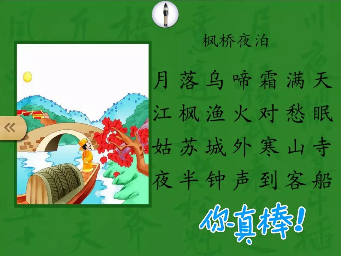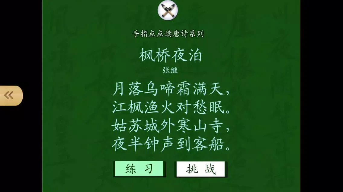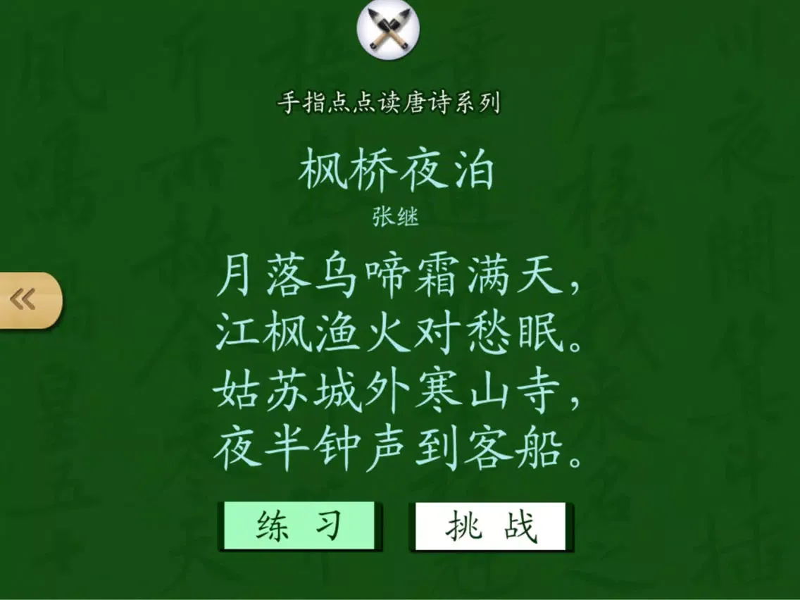 内容包括了通常的诗配图、有声朗读等功能之外,创造性地将唐诗的认读分成了“练习”和“挑战”两个部分。