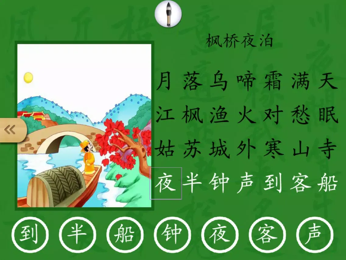 在挑战部分,孩子需要从多个字中顺序找到每句诗歌,只有每次都点击正确,才能完整地让软件读出唐诗。