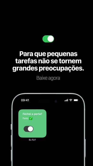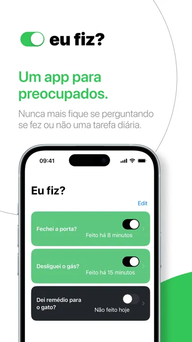 Eu Fiz? é a sua solução para nunca mais ficar pensando se fez uma tarefa cotidiana ou não. Esqueceu se trancou a porta? Desligou o gás? Com o Eu Fiz?, você pode criar facilmente lembretes personalizados para todas as suas tarefas diárias.
