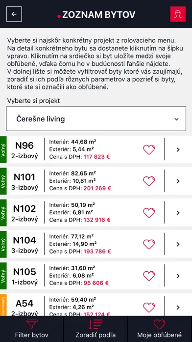 • Obľúbené byty - vytvorte si zoznam obľúbených bytov a majte ich vždy poruke, sledujte ich stav a ich obľúbenosť medzi ostatnými používateľmi