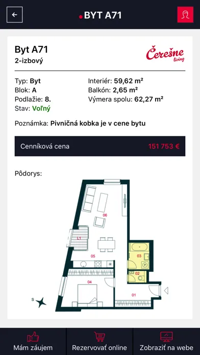 Aplikácia ponúka aktuálny zoznam bytov jednotlivých projektov, zoznam obľúbených bytov, možnosť rezervovať si byt z projektu Čerešne living online alebo prostredníctvom interaktívneho výberovníka štandardu bytu si pozrieť, ako môže vyzerať vaša budúca kúpeľňa, či spálňa. Výšku hypotéky si zasa vypočítate vďaka hypotekárnej kalkulačke alebo získate prehľad o novinkách, akciách a aktuálnom stave výstavby projektov.