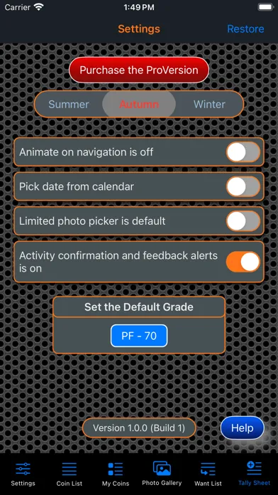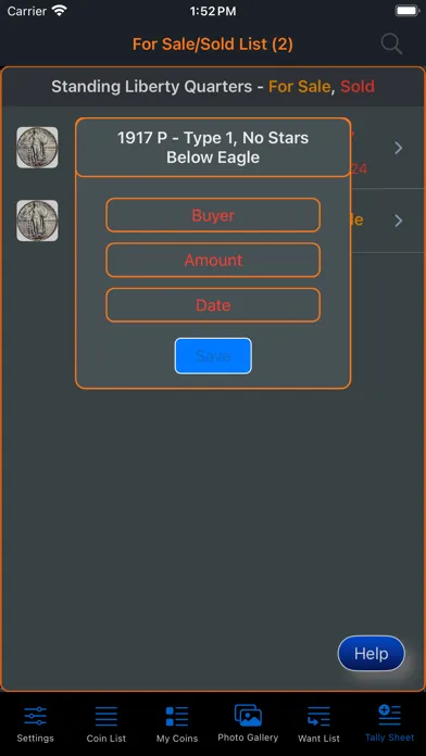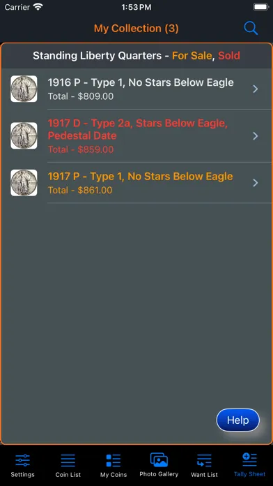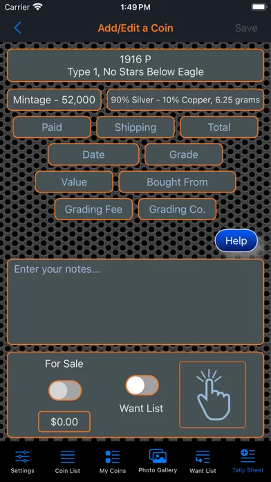 This app will provide the ability for the user to organize, track and manage their collection of coins. Images of each coin can be included with the collection. There is also a means within the app for the user to peruse all of the images in an entertaining manner. The app has three (3) color themes which help to make the app more enjoyable. A running tally of the cost for the entire collection is provided. A want list is also included in the app to allow you to ear-mark coins that you are searching for.