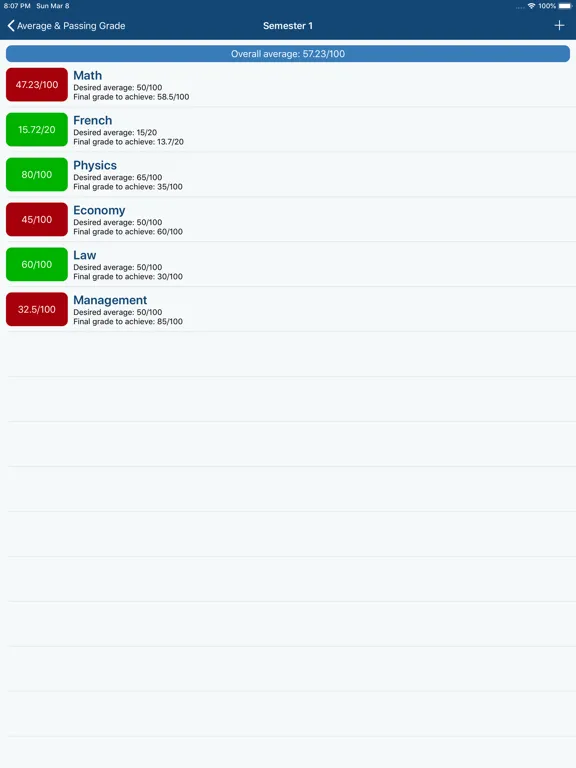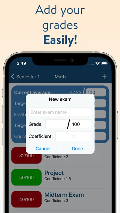 Just enter your desired average and all the grades you already have, along with their corresponding coefficients, and the app computes your average in each course, your overall average for the semester and the passing grades!