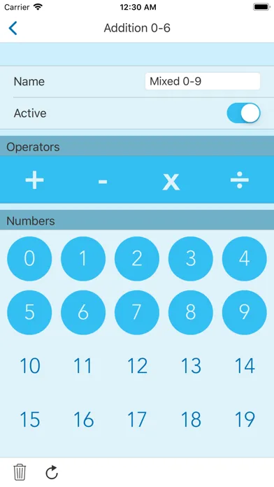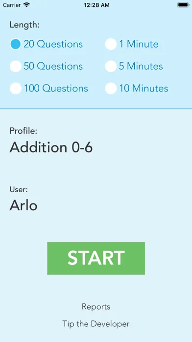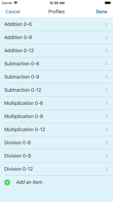 • Set up custom profiles to control which questions are given: select one or more operators, a collection of numbers up to 24, optionally including negative numbers, and an optional restricted set of multipliers for multiplication and division (e.g., to practice only multiples of 9).