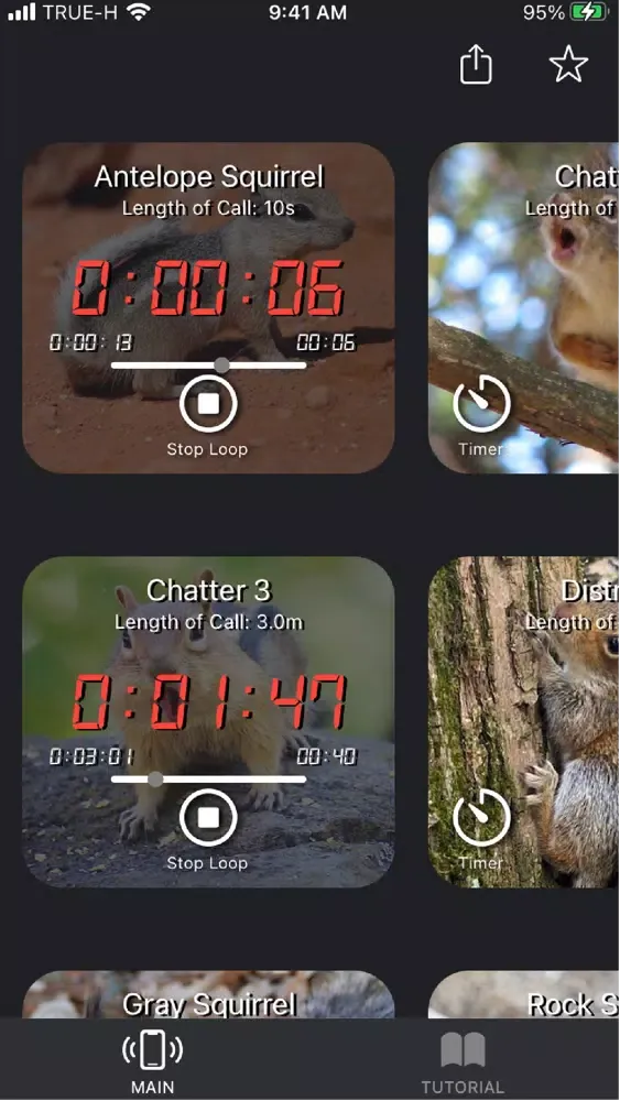 3) Align the calls so that you can easily see three calls and loop them at the same time. You can loop as many calls as you wish but it is recommended to use only 1-2 at once lest you scare off a target! This app is designed so that you can easily see and operate 2-3 calls and be able to see the calls in action on your screen. This is the only squirrel calling app in the App Store with this exceptional functionality!