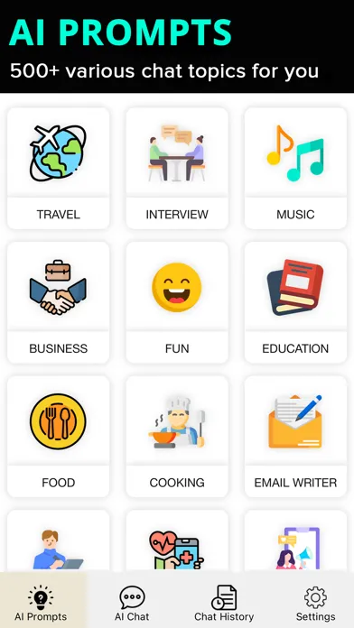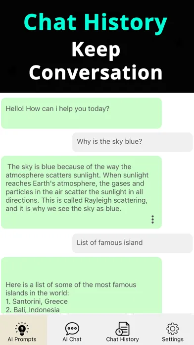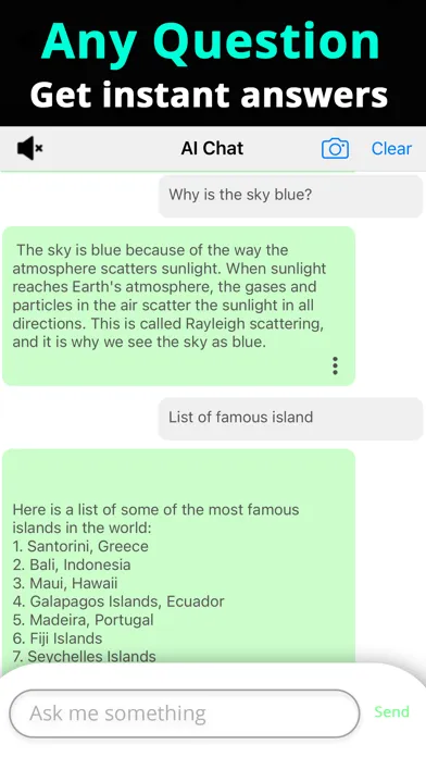 "AI CHAT" can help you with a wide range of tasks. AI Chat app including generating stories, travel guide, sales, business, interview, fun, music poems, song lyrics, scripts, providing language practice and text translation, finding information, suggesting food recipes and dad jokes, creating a one-week trip plan to Europe, solving math equations, and much more!