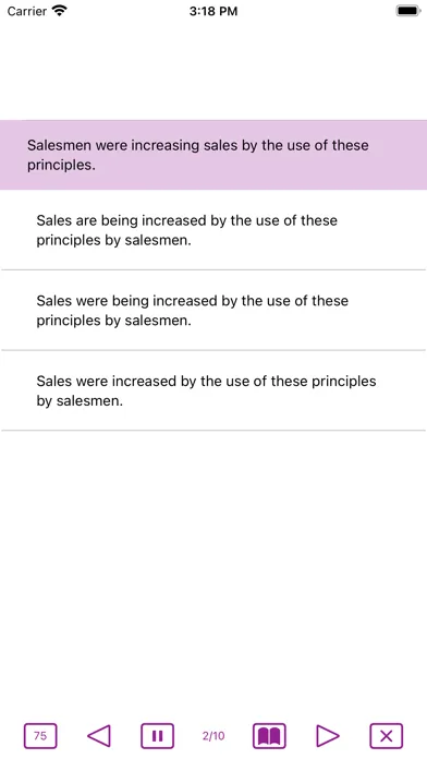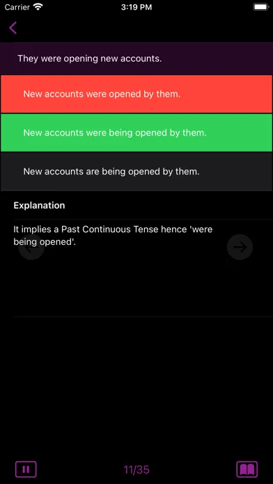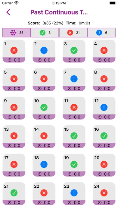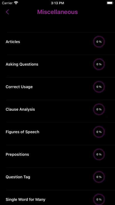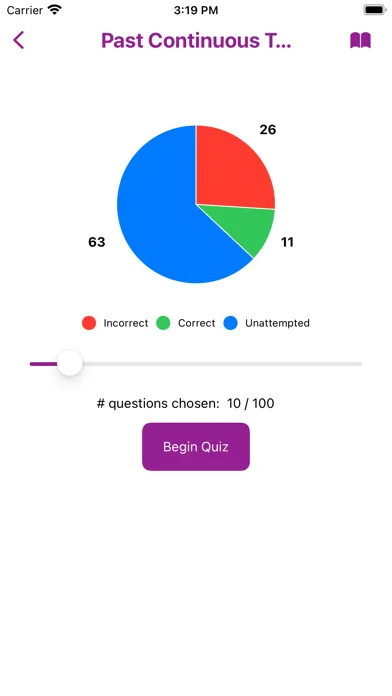 You can study the grammar rules by topic. All questions are sorted by topic. It also tells you the areas that each topic covers. Choose your own timer setting and number of questions you would like in each test. Special algorithm randomizes questions every time you take a test.