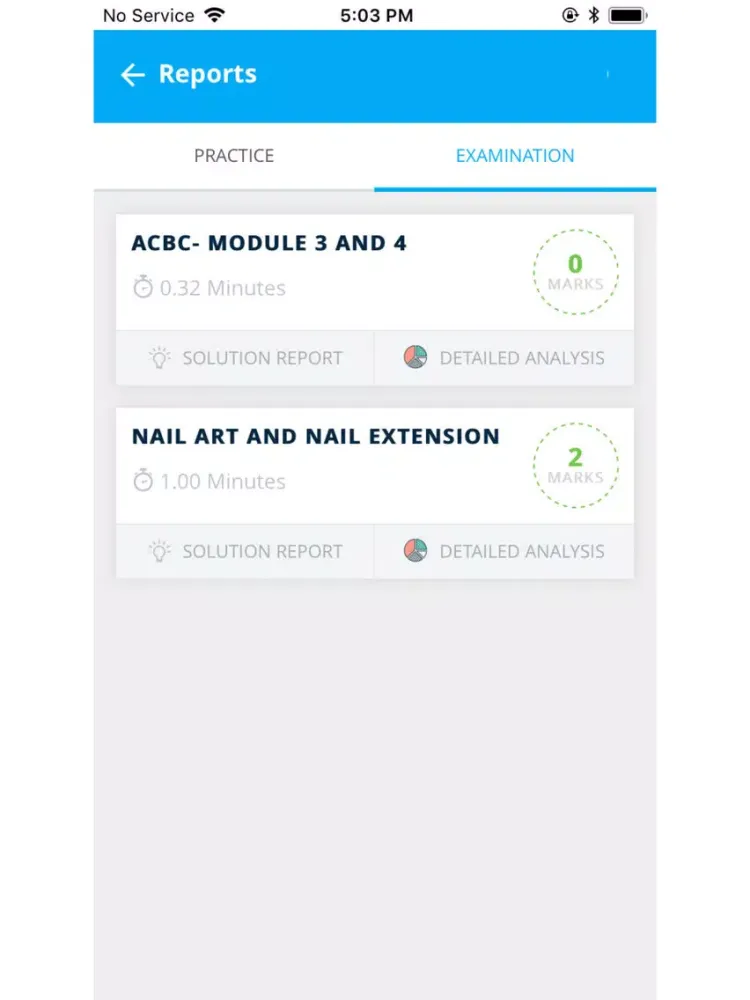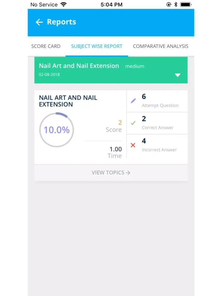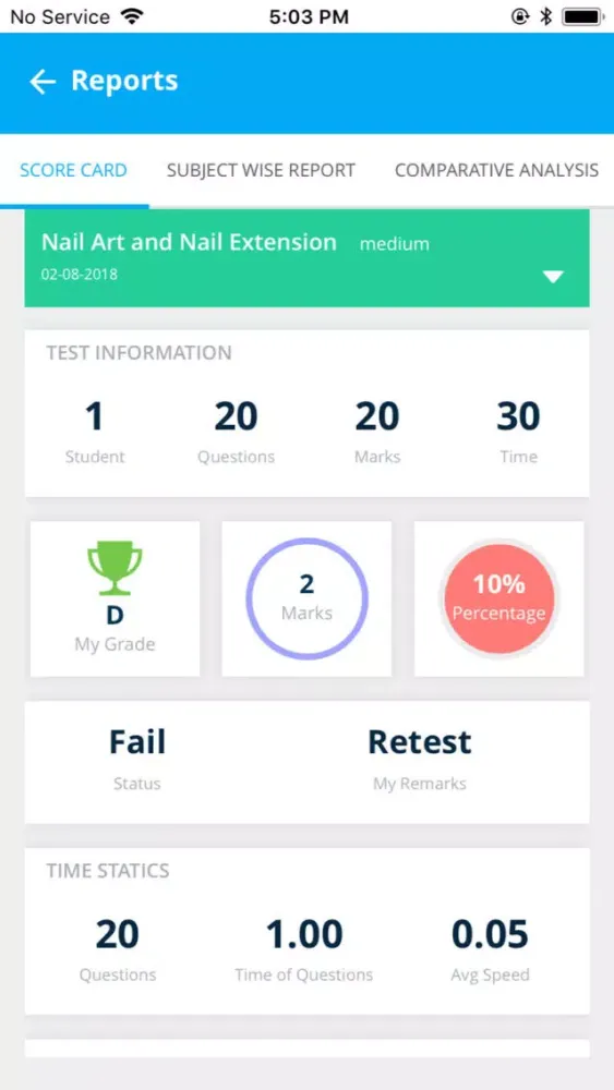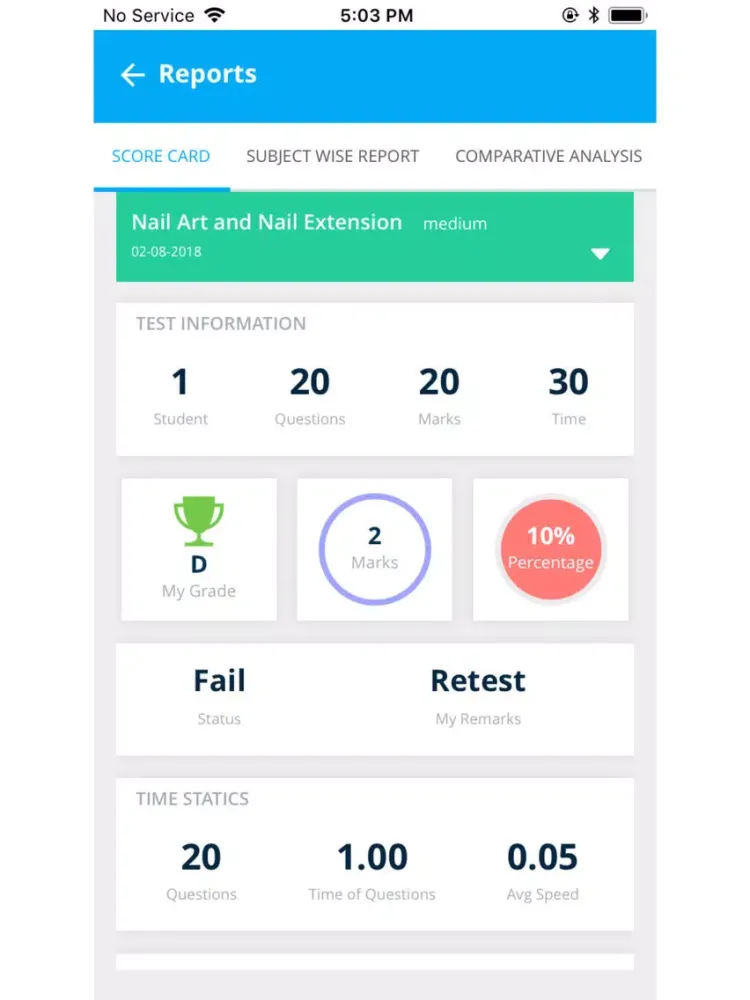 Our online exam provides a detailed analysis about the students score card covering each section individually.