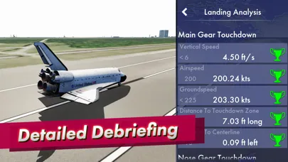 Each flight starts at either 10,000 feet, already aligned with the runway, or at up to 50,000 feet, before banking into the heading alignment cone. During descent, the Orbiter is an unpowered glider, so you will only have one chance to get it right. Astronauts used to call it a flying brick: Because of its 200,000 lbs. gross weight and low lift over drag ratio, the approach is six times steeper and two times faster than a typical airliner approach. After your first safe touchdown, chase that perfect landing, compare your high scores online with your friends, earn medals, and unlock achievements. Experiment with different wind conditions, night approaches, and even emergency scenarios or system failures. At the end of each flight, watch a replay from different camera angles.