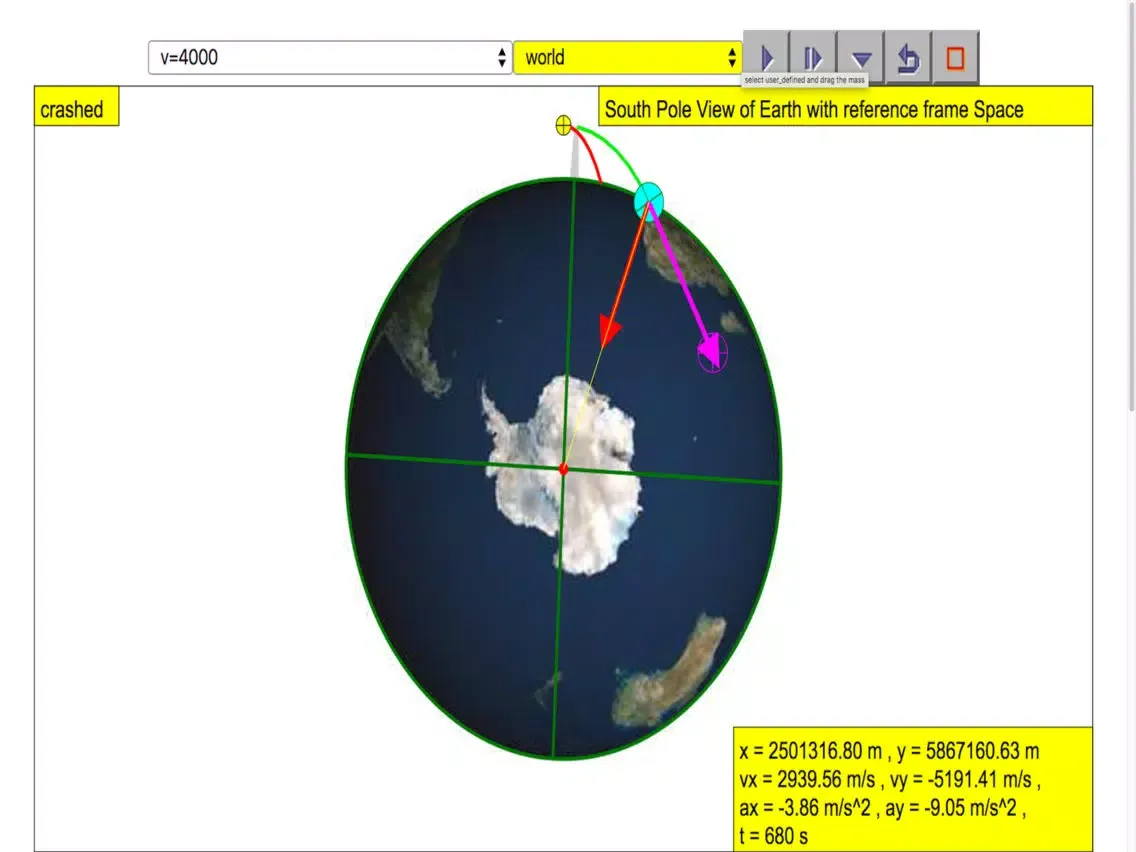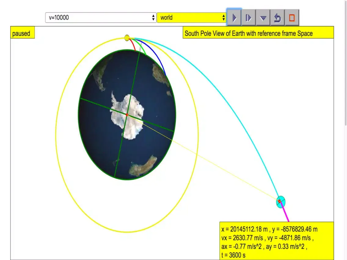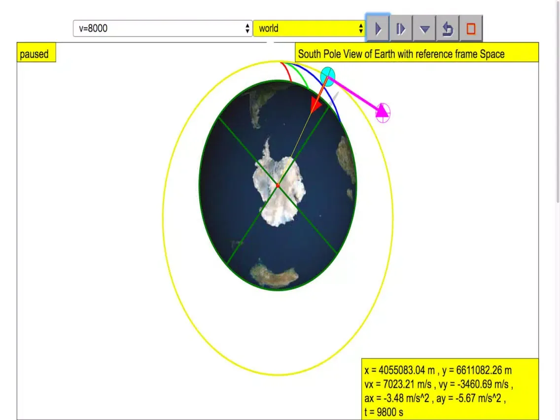 An object projected horizontally near the Earth’s surface follows parabolic trajectories as shown ( v = 0 red, v = 2000 green, v = 4000 blue, v = 6000 yellow and v = 8000 teal) .