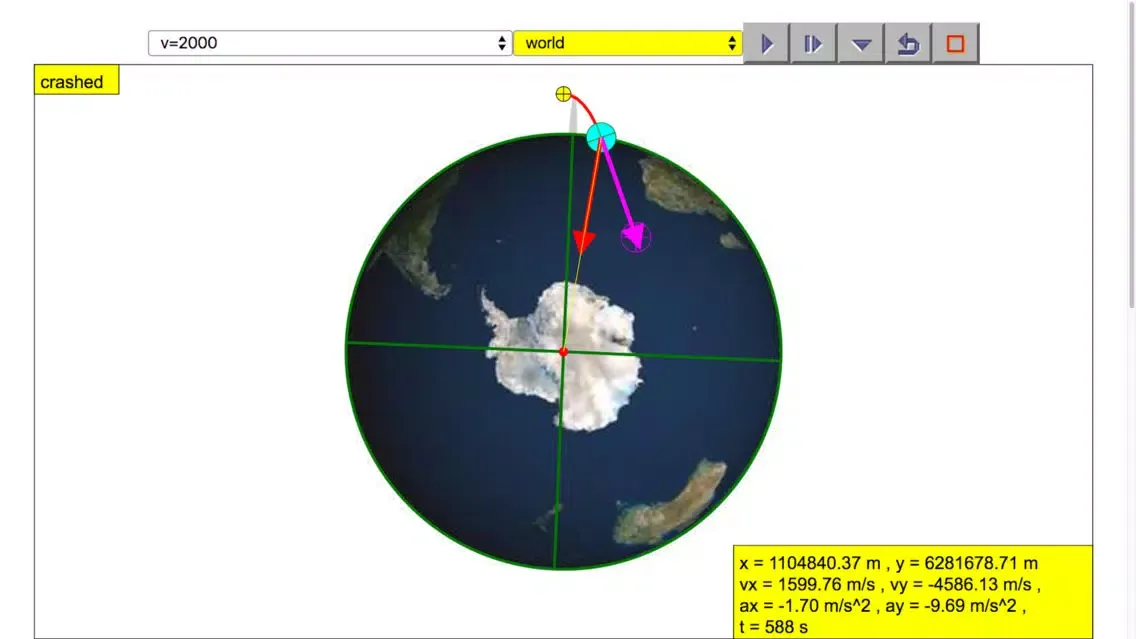 Many man-made satellites move in circular orbits around the Earth. The first man-made satellite, the “Sputnik 1”, was launched by Soviet Union in 1957. Since then, thousands of satellites have been launched into orbit around the Earth. The only force acting on a satellite in a circular orbit (achieved by launching horizontally at vx =7276.69 m/s at height above Earth surface H = 0.185 RE where RE = 6370 000 m is the radius of Earth, is the Earth’s gravitational force. The gravitational force (red arrow is directed towards the centre of Earth) is also the the centre of the circular orbit.