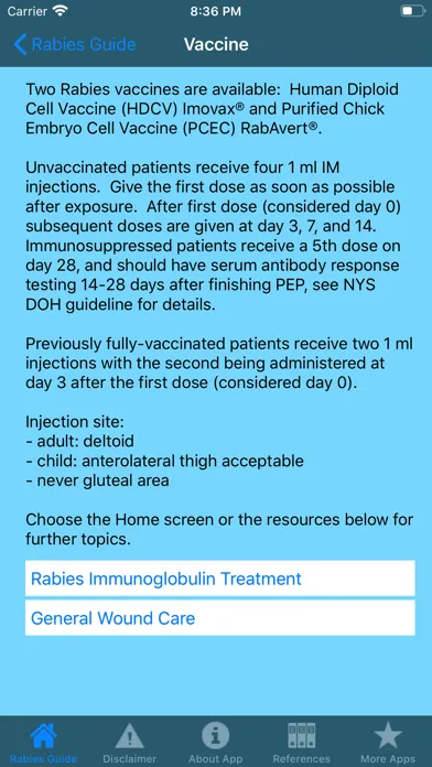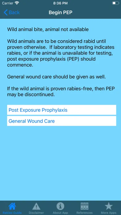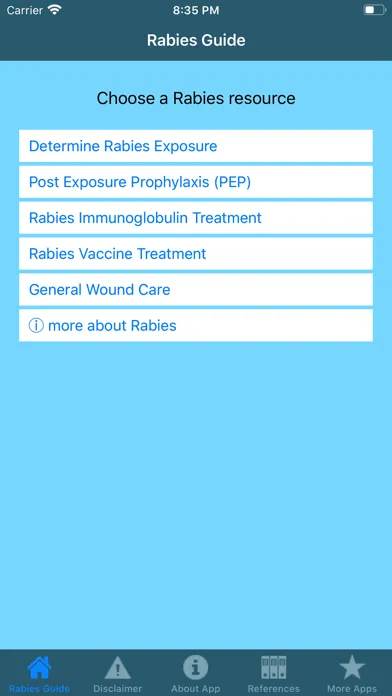 Rabies Guide presents guidance for clinicians handling patients with potential rabies exposure. Based upon the New York State Dept of Health 2010 guideline supplemented by the Center for Disease Control and Prevention, the app walks the provider through the decision steps considering which animal was involved, the nature of the bite or exposure, the availability of the animal for rabies laboratory testing, and details on both rabies vaccine and immunoglobulin treatment.