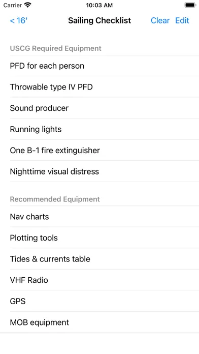 Sail safely with Sailing Checklist. It comes with checklists for USCG regulations and various boat sizes. You can even create lists for specific boats and turn on or off various items in any of the lists. Each item can also include notes about the specific requirement. For instance, the USCG "Sound producer" requirement for 16' sailboats is "Whistle, Horn capable of 4 second blast audible for 0.5 nautical miles."