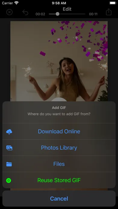 [Add GIF] enables you to add your favorite GIF animation to any videos and photos.