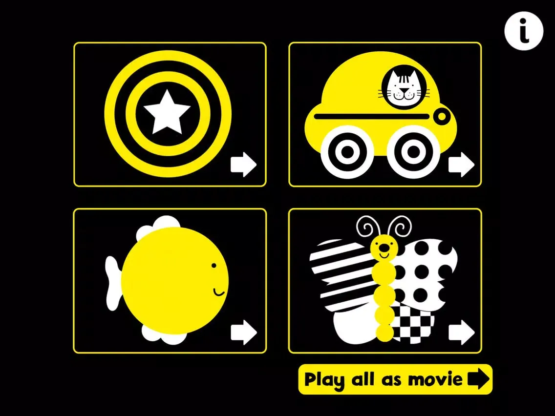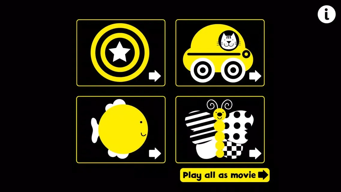 • Each animation contains simple and engaging shapes, patterns and images in high-contrast black, white and yellow