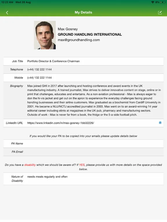 View your details, delegate list, conference and meeting schedules, request and approve meeting request.