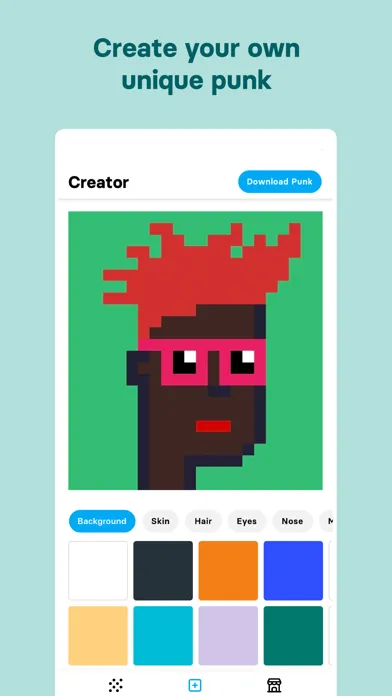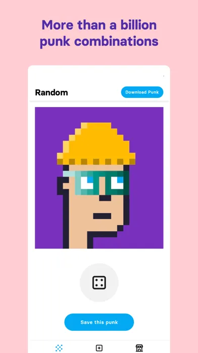 With NFT Punks app you can create more than a billion unique punk faces. Take your punk to your favorite marketplace and mint them as NFTs, use them for your avatars or hang them on your wall. Use the random feature and get special rare punk parts for ultimate unique punks.