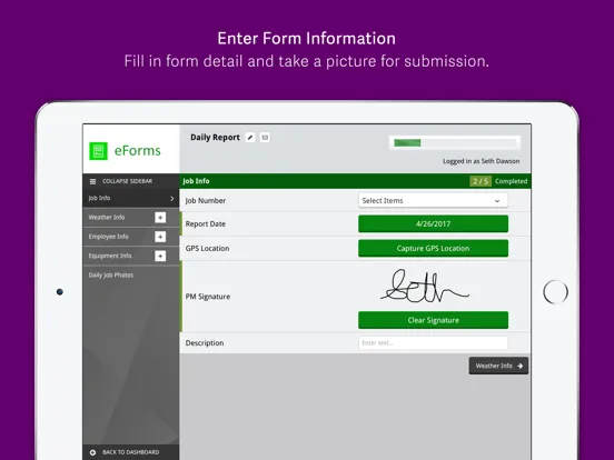 Users can route between themselves, for collaboration, before submitting back to your SPC server. Capture the following: Published items (Job #'s, Vendors, etc.), Text, Dates, Time, GPS locations, Signatures, Photos or anything you want to submit back to the Sage Paperless Construction application.