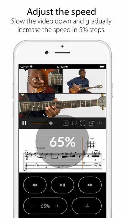 Set a loop and let the app repeat certain parts of the video. Adjust the tempo of the video in 5% steps. Play/Pause and forward or rewind.