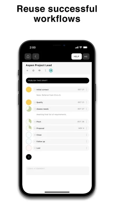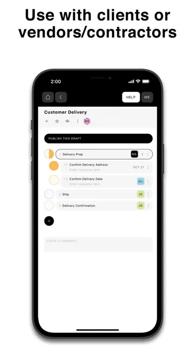 Share tasks with anyone, whether they have the app or not. This makes it great for things like guiding a potential client through a process of deciding to work with you, or coordinating a project with an outside consultant.
