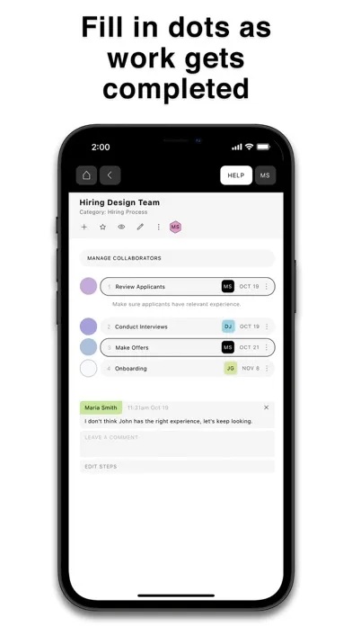 Dots represent steps in the process. As you fill in dots, collaborators get notified (if you wish).
