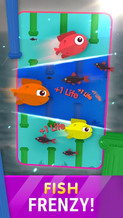 - Fish Frenzy: An addictive adventure game with a twist that will test your timing and patience. Tap the screen to make the fish swim and avoid the columns. When it turns night you have to also avoid sharks that come out to hunt. If you get far enough in the game you will get boosts and extra lives. Fish Frenzy is a simple but challenging game that will make you want to try again and again.
