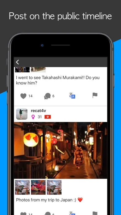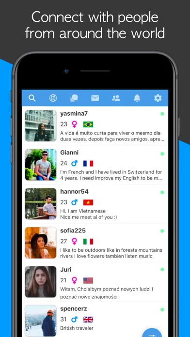 Meet foreign people, find language exchange partners, or just browse the public timeline to see what's happening around the world. It's great to use as a language exchange app or just to meet international friends.