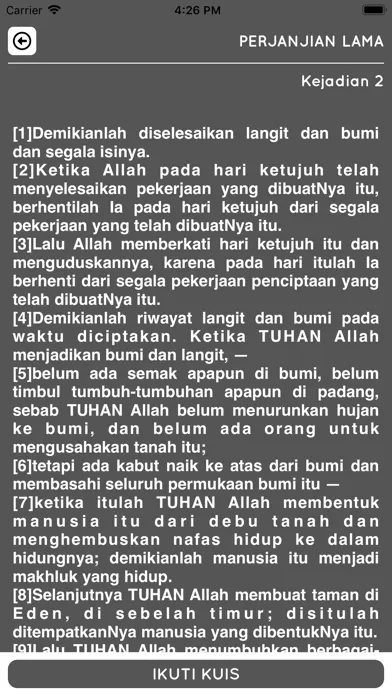 Aplikasi ini bisa berfungsi sebagai Alkitab dan Quiz Alkitab sehingga pengguna bisa mereview apa yang telah dibaca. Pengguna juga bisa memantau sudah berapa hari pengguna login dan sudah membaca berapa pasal. Yukk perdalam pengetahuan kita tentang Alkitab dengan aplikasi ini.