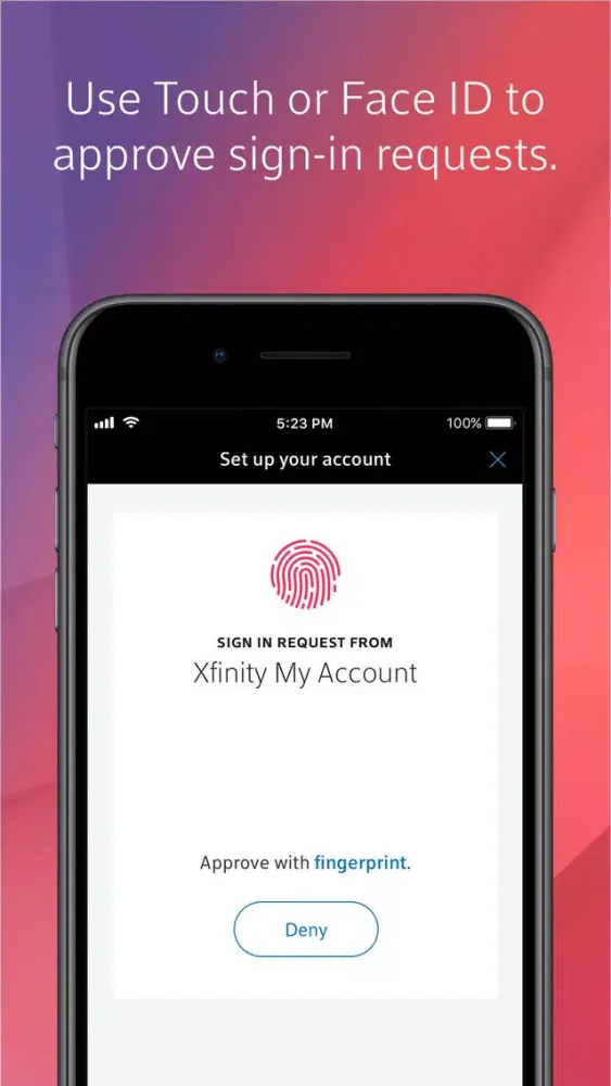 The Xfinity Authenticator app helps keep your information safe even if someone gains unwanted access to your Xfinity ID. This extra layer of security helps prevent anyone who does not have your permission from signing into your Xfinity account. Authenticator works with our Two-Step Verification, so it's easy to approve sign-in requests with Touch or Face ID.