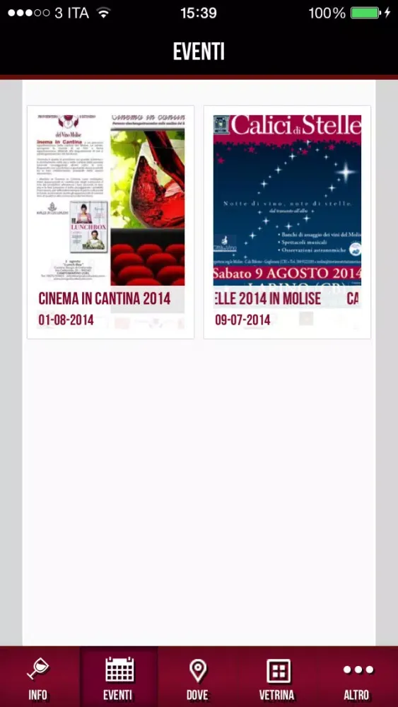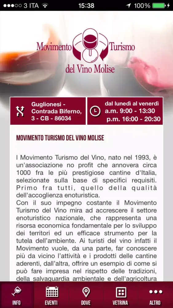 L'Applicazione Movimento Turismo del Vino Molise nasce come applicazione ufficiale del movimento stesso, per permettere a tutti gli utenti iPhone e iPad di avere informazioni sulle attività enogastronomiche della nostra regione e di visualizzare in modo veloce le cantine più vicine alla propria posizione o di individuare una specifica cantina dal nome della stessa, oppure fare una specifica ricerca in un dato luogo in cui vogliamo ricercare le cantine più vicine a quel luogo. Il Movimento Turismo del Vino Molise rappresenta tutti i principali eventi organizzati con la finalità di far avvicinare sempre di più gli utenti al mondo del vino, tra le nostre iniziative annuali vi segnaliamo: