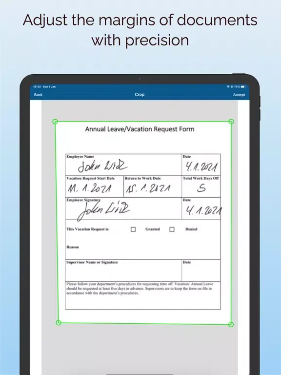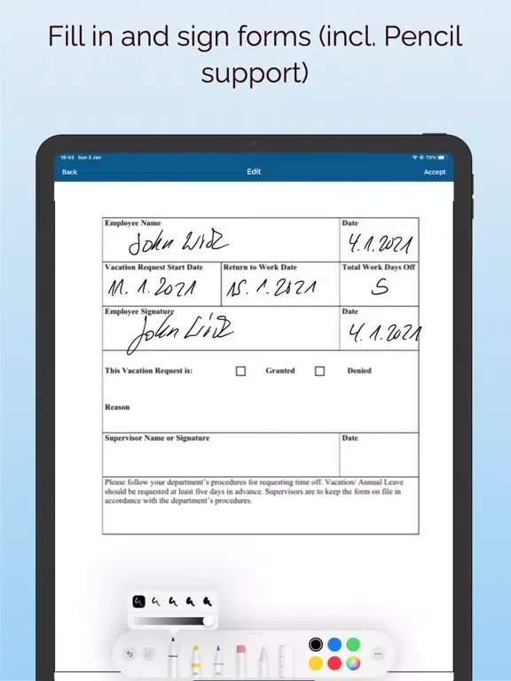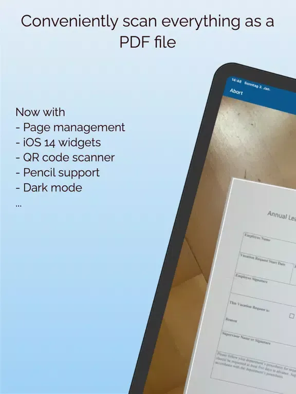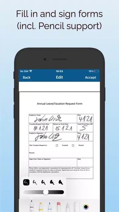 Do you have to fill out and sign an application? In the past, a printer was needed to print out digital requests, fill them out, scan them in and send them off. With this app you can easily scan the request or add it from the photo library and fill out/sign it on your device. Afterwards the completed request can be sent away as a PDF or graphic file. You no longer need a printer and/or scanner and the entire process takes only a few minutes. On the iPad, it is going to be a pleasure with the Apple Pencil!