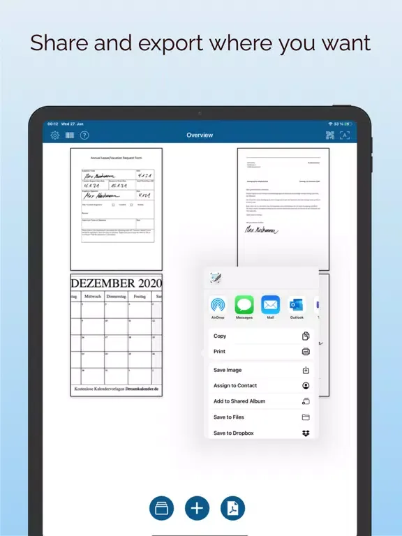 • Share the created file via the Apple-Sharing dialogue (Print, Save, Email, Messenger, AirDrop, Cloud etc.)