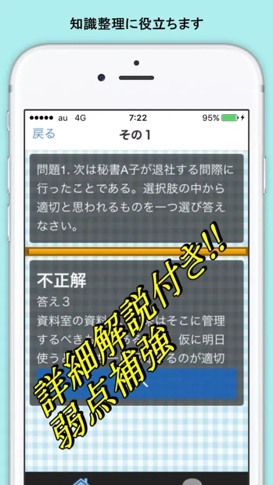 一般知識、秘書の資質、職務知識、マナー接遇、技能にを1問1答式でランダム出題することで知識の確認ができます。
