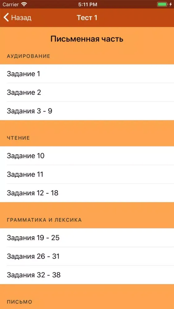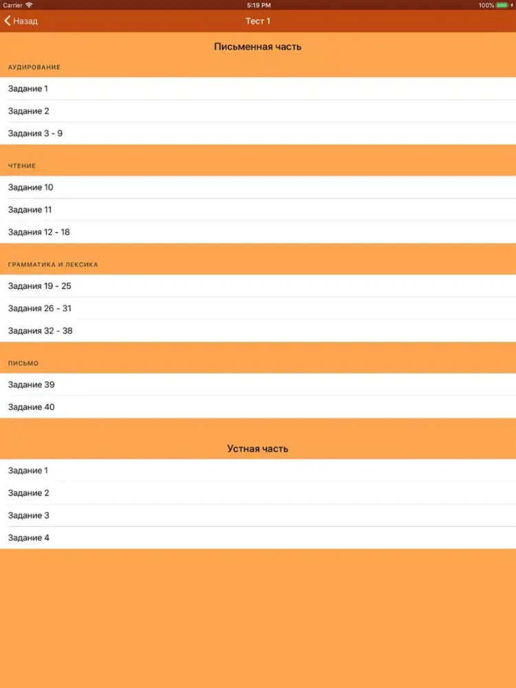 Для перехода от одной части теста к последующей, а также возврата в меню пользуйтесь кнопкой «Назад» вашего устройства.