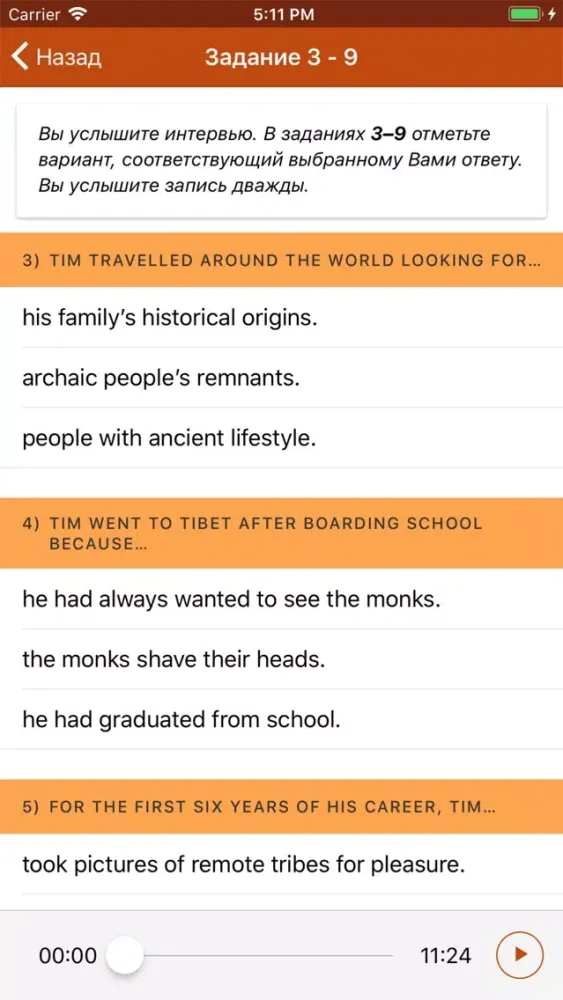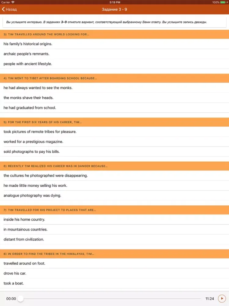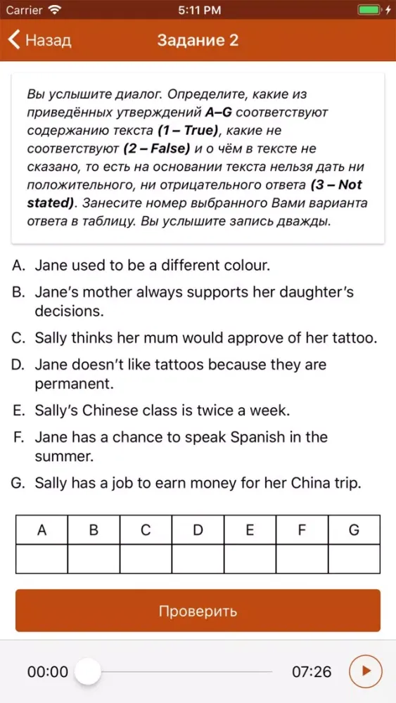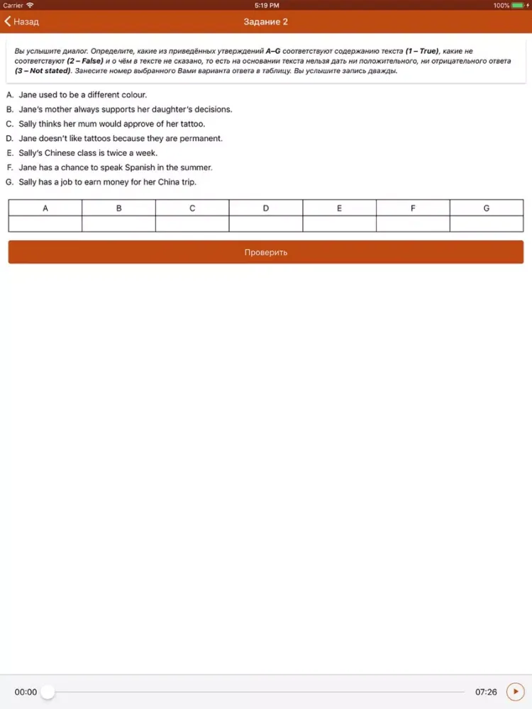 Аудиозаписи к тестам ЕГЭ можно прослушивать повторно, добиваясь максимального понимания. Все задания тестов интерактивны, ответы можно исправлять до тех пор, пока вы не нажали кнопку «Проверить». ВНИМАНИЕ: ответы надо впечатывать полностью, не пользуясь подсказкой встроенного словаря в мобильном устройстве. Если ответ не впечатан самостоятельно, программа может отметить его как ошибочный.