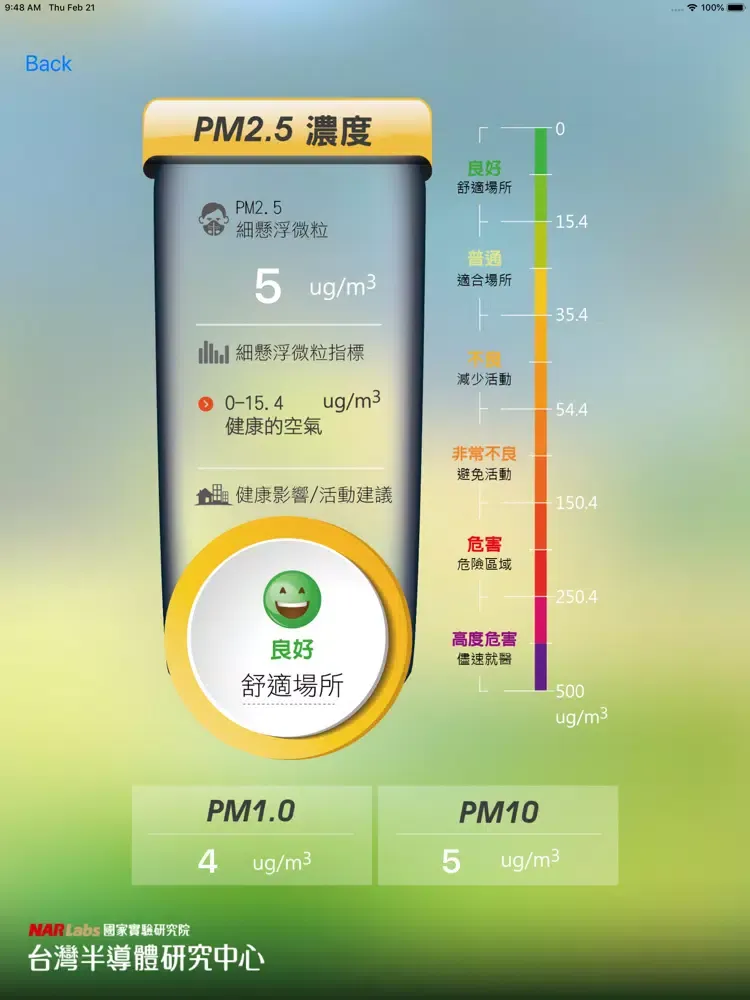 有鑑於近年來空汙危害健康的議題逐漸被國人重視,TSRI運用嵌入式軟硬體及感測等關鍵技術開發出一組體型輕巧的「AQ 御守護」,內建細懸浮微粒PM2.5氣體感測器及藍芽BLE通訊功能,使用者可透過手機應用程式即時得知空氣品質資訊,隨時隨地偵測環境異常狀態,確保生活安全無虞。