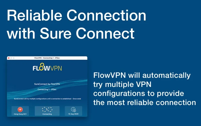 SureConnect: FlowVPN will try connecting via IPSec, OpenVPN and SSH to get you the best Internet connection. This is exclusive to FlowVPN!