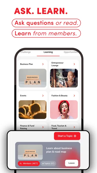 Confused? Ask questions on interest-based topics. Want to learn how to grow your business? Check our learning section. Want to increase earnings and profit? Check the opportunities section. Here are the full features in detail on our online networking business app.