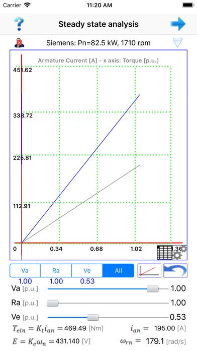 The second tab is useful to perform a steady state analysis of the selected DC motor. In particular are shown the Motor Shaft speed [rad/s] and the Armature current [A] in function of the Electromagnetic torque. The electrical and/or mechanical quantities are plotted, by touching the screen it is possible to see the values of the graphed quantities. In this version of the app is possible to see also numerical values of the graphed quantities, by touching the bottom left area of the graph window.